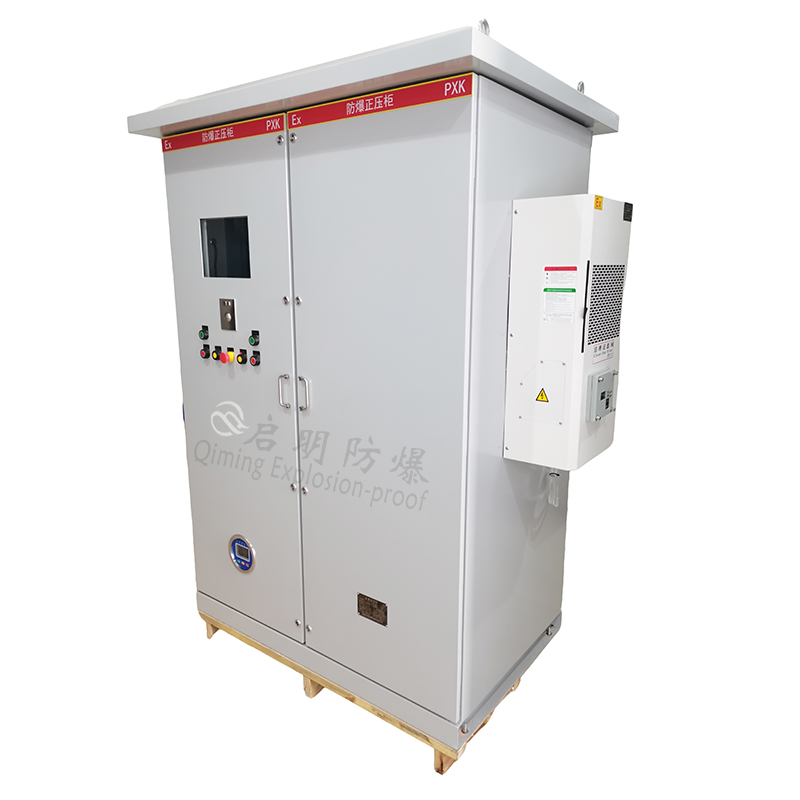 配电柜在自动控制系统的控制下,通入保护气体,正压腔内压力高于正压腔外的压力,形成微正压的安全小环境,从而阻止了可燃性危险气体进入正压腔内,保证内装普通仪表和电器元件的安全运行。