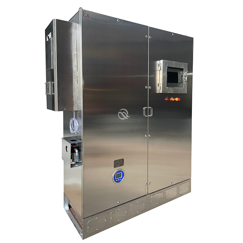 本产品是通过防爆仪表箱内的智能单片机控制系统与气体压力控制系统匹配,将洁净、安全的压缩空气或惰性气体引入正压腔,完成吹扫柜体内部的可燃性气体或粉尘,并能够维持正压腔内一定的压力,使正压腔内形成微正压,阻止外界危险气体或粉尘的进入,达到防爆的目的。